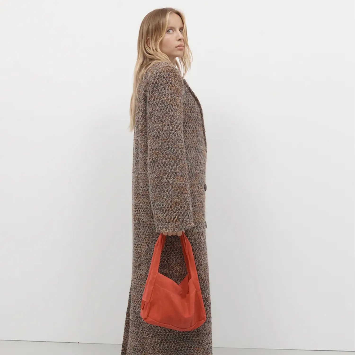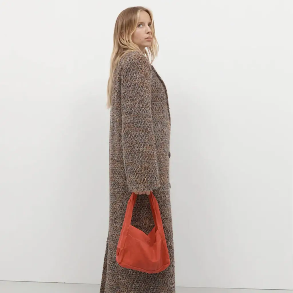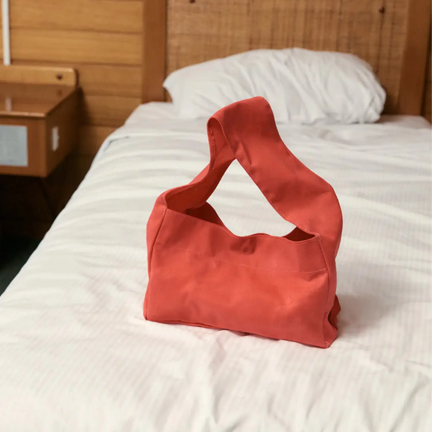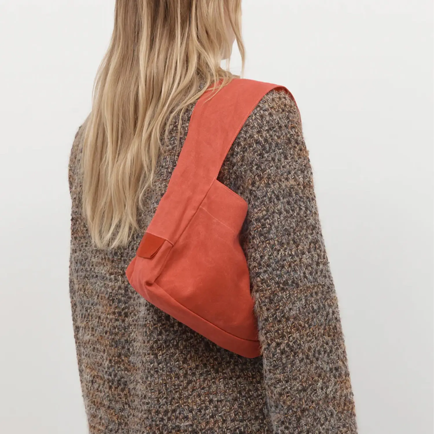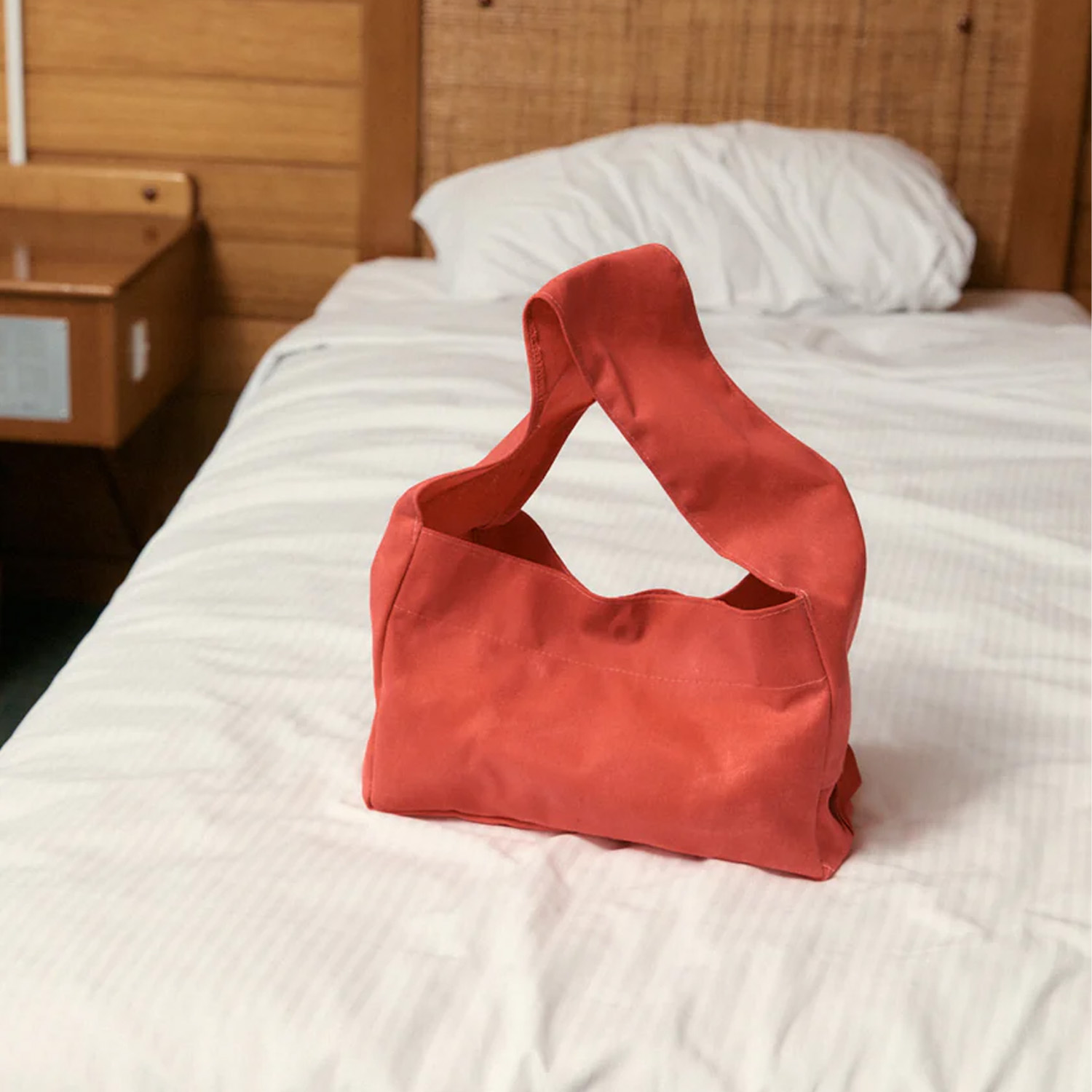 The Après Studio bag in waxed red. An elevated tote featuring a thick shoulder strap and a flat base with a snap button closure. Made from a waxed red cotton canvas.