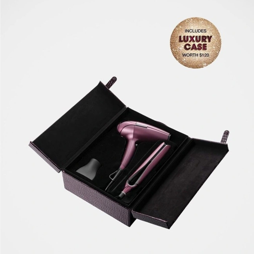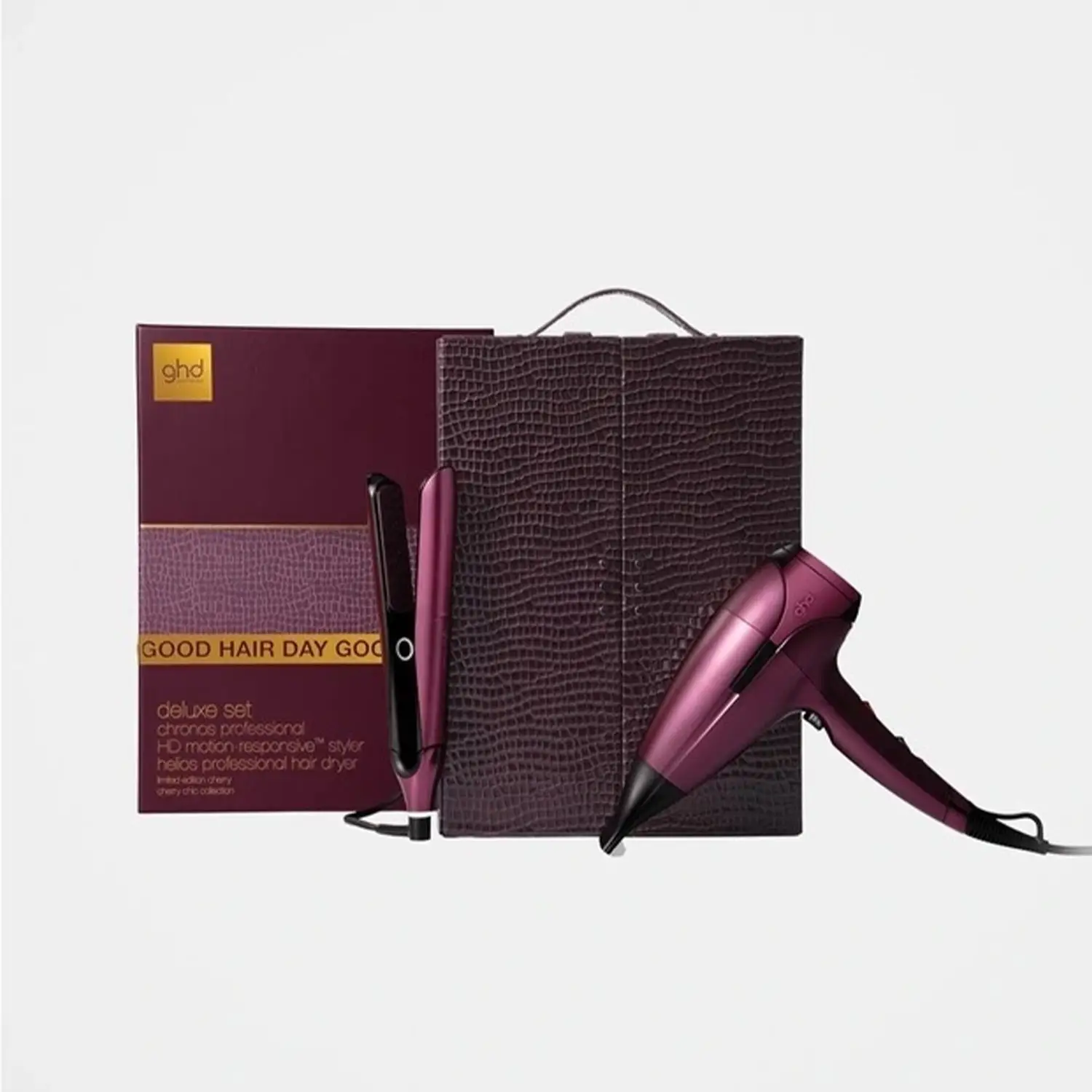 This limited-edition set invites you to embrace timeless, seductive styling with tools that elevate your beauty ritual. Featuring the ghd Chronos professional HD motion-responsiveTM styler and the ghd Helios professional hair dryer, both draped in an opulent cherry red and presented in a luxurious croc-inspired vanity case.