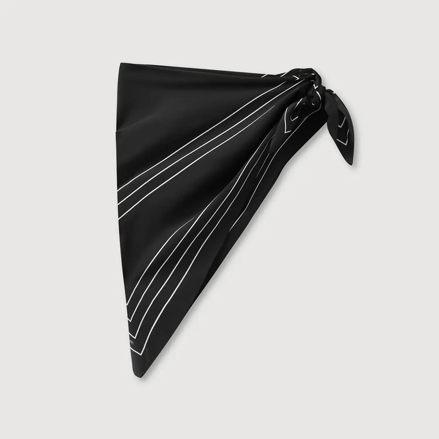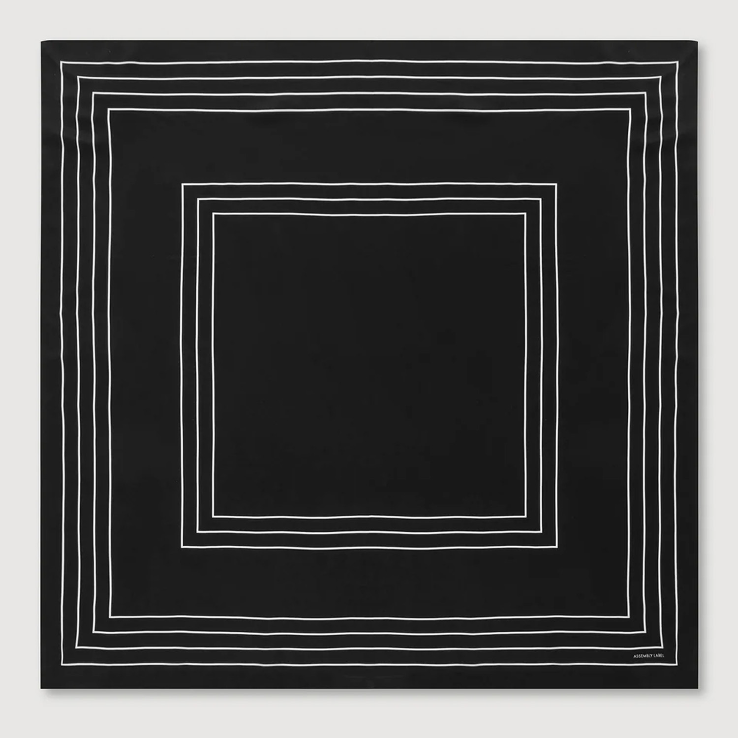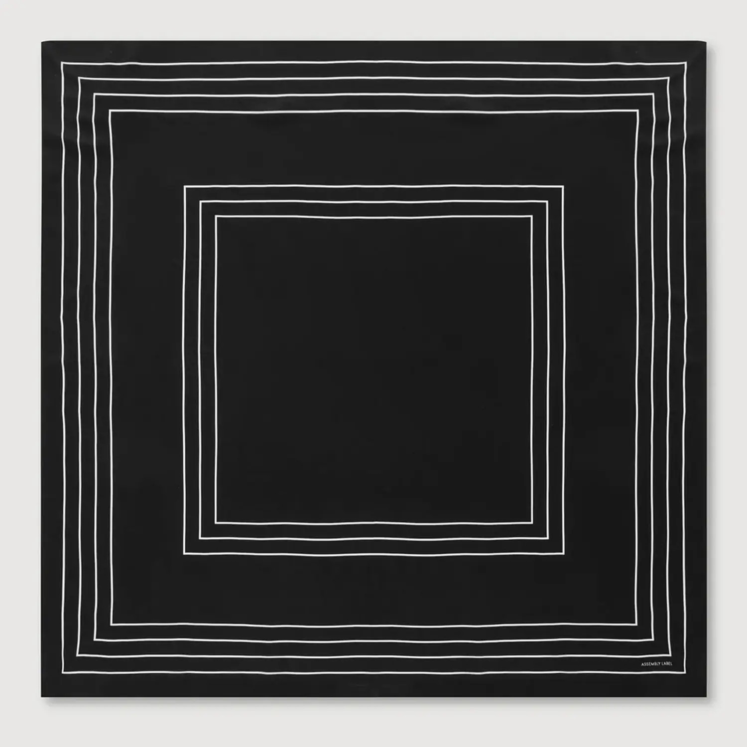 Square shape scarf, crafted from 100% silk, featuring a striped border. A versatile styling piece, it can be worn as a top, bag accessory, or layered over clothing.