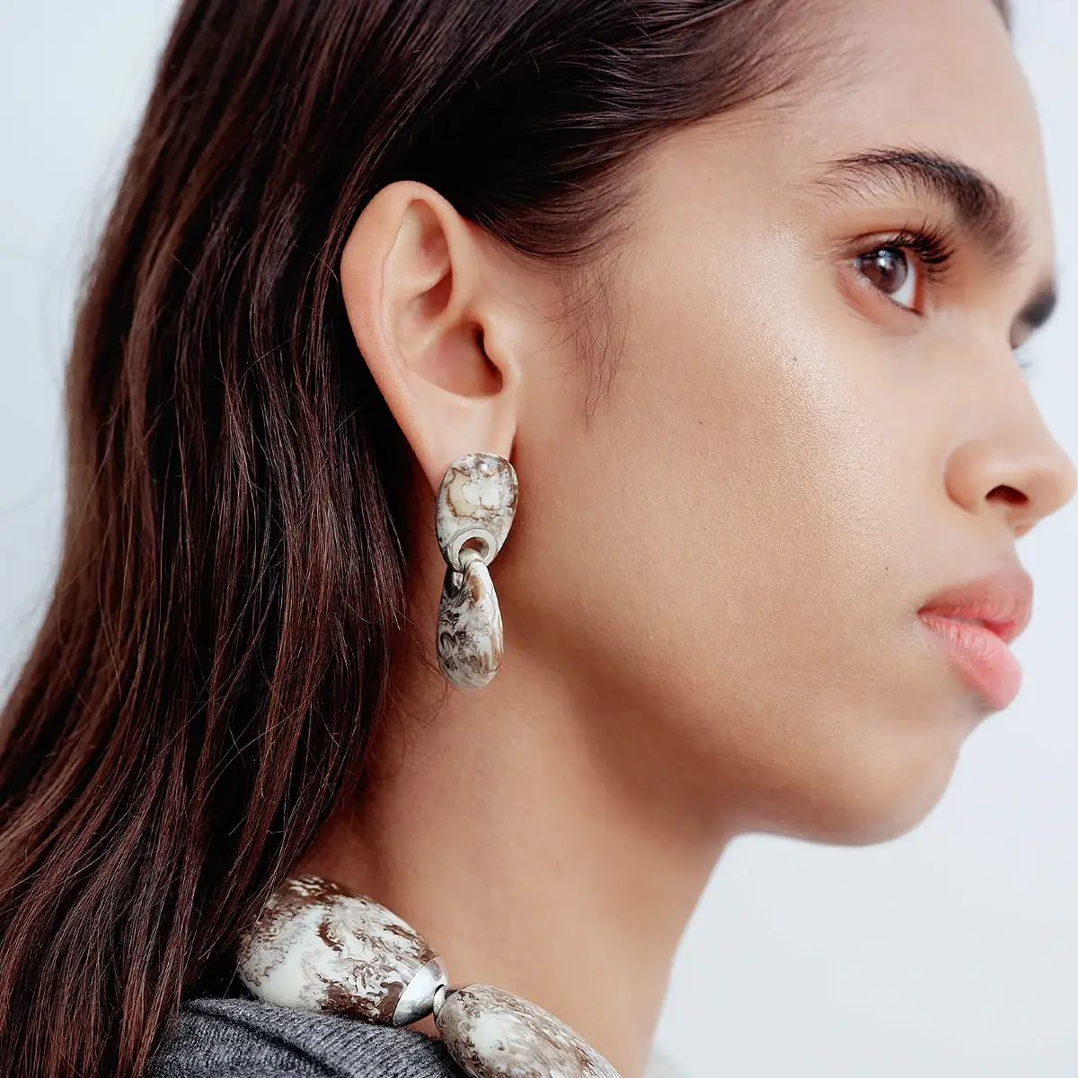 Referencing organic rock formations, the Small Rock Duo Earrings connect two rounded resin beads, refined to a polished finish.